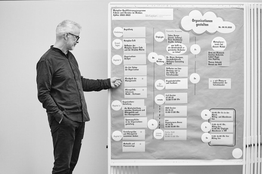 Teilnehmer:innen des Programms belegen drei Seminare, die für das Metaplan Professional Programm „Führen und Beraten im Diskurs“ entwickelt wurden und nach wie vor Teil dieses Programms sind. In diesen Seminaren lernt man also mit Unternehmer:innen, Berater:innen und Manager:innen zusammen, die z.T. ein anderes Programm gebucht haben. Das erhöht die Intensität des Austausch und bereichert den Lernprozess durch eine Vielzahl von Perspektiven.